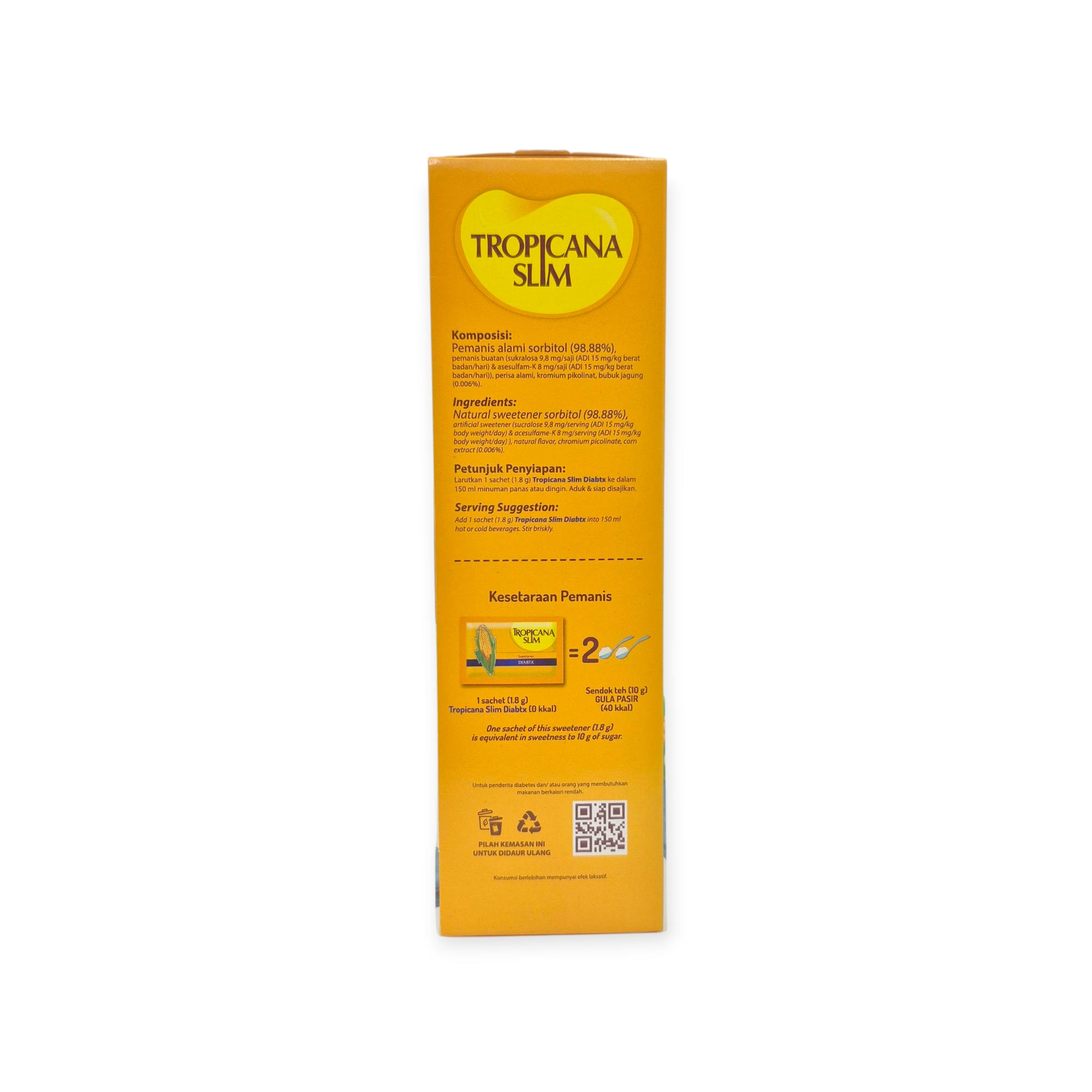 Tropicana Slim Sweetener is a low-calorie sugar substitute, perfect for those who want to enjoy sweetness without the extra calories. Made with sucralose, it contains no added sugar and is suitable for people managing their weight or blood sugar levels, including diabetics.