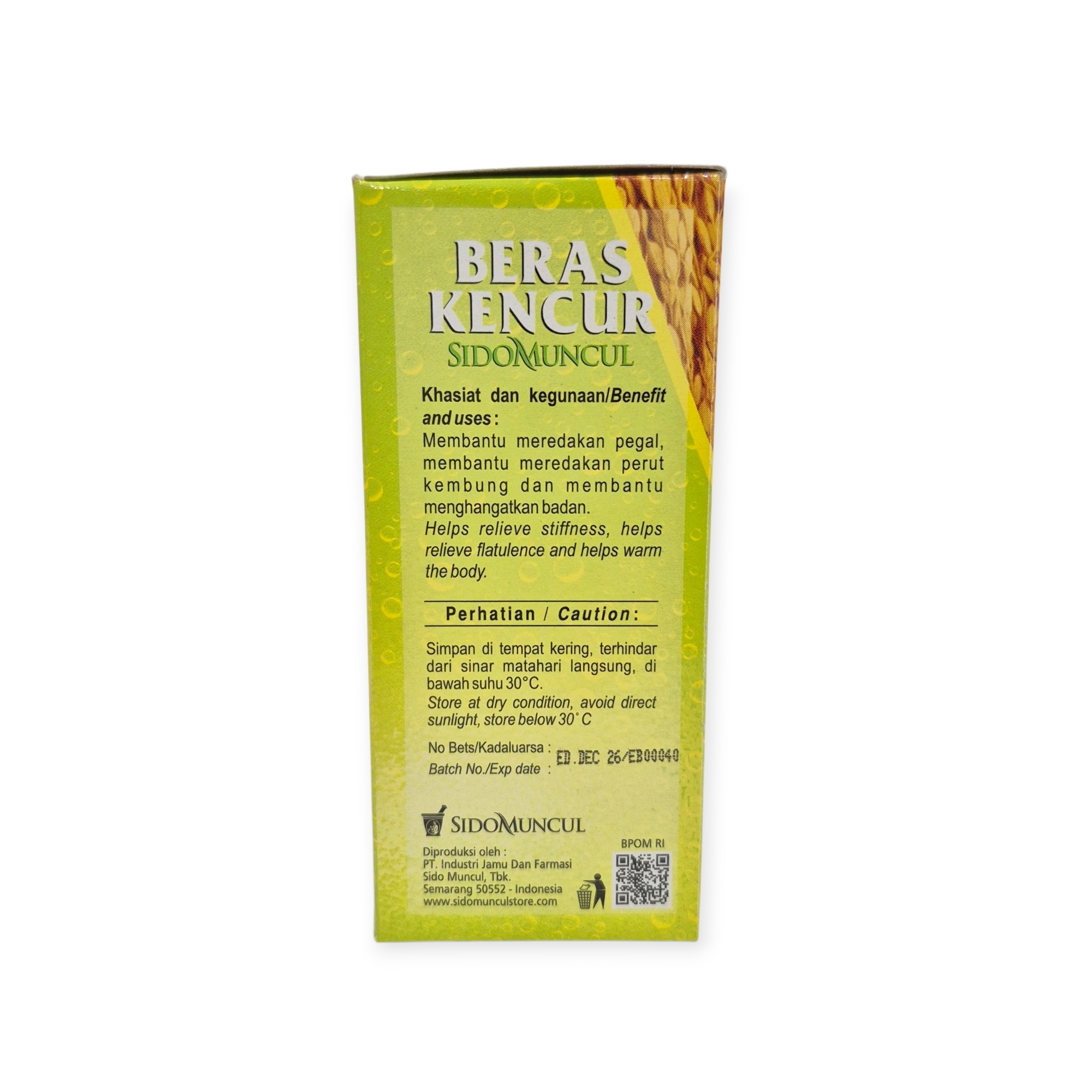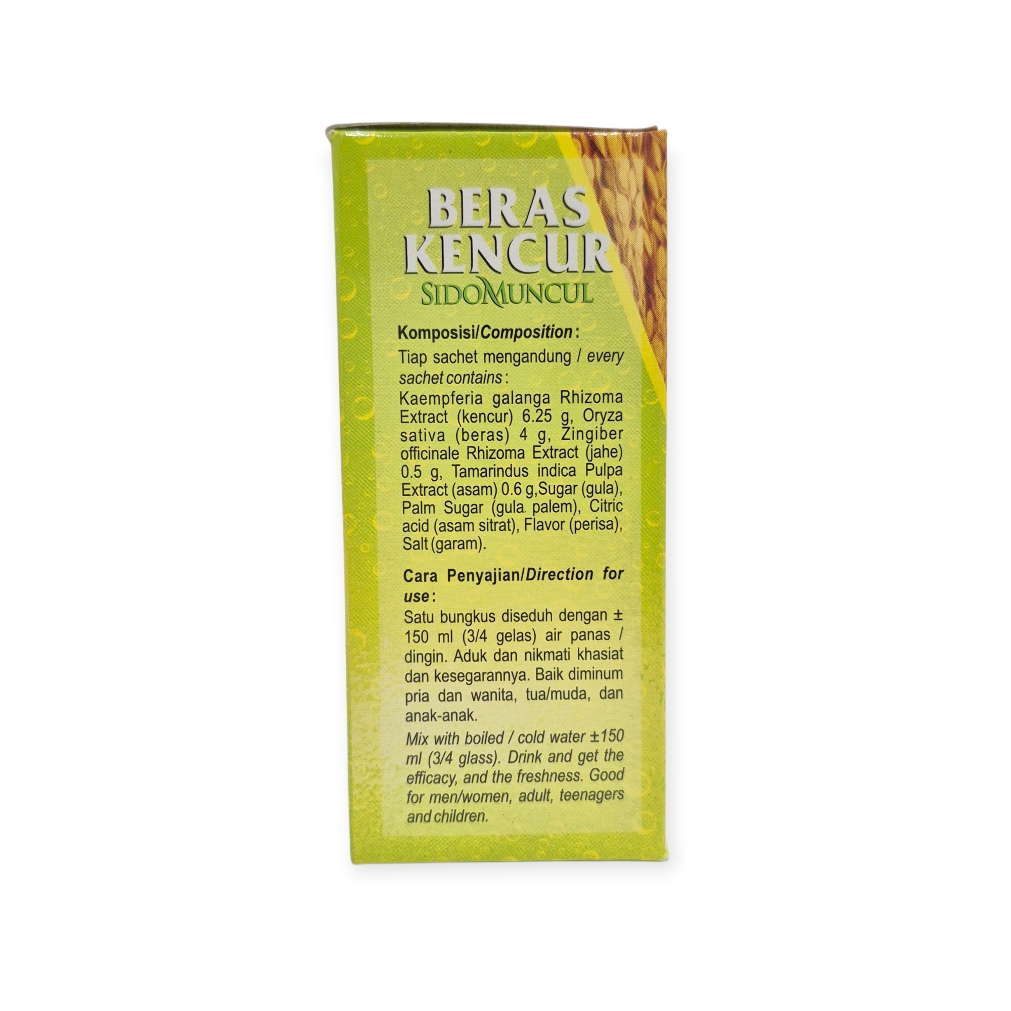 Sidomuncul Beras Kencur is a traditional Indonesian herbal drink made from a natural blend of rice (beras) and aromatic galangal (kencur). Known for its refreshing taste, this herbal drink is traditionally consumed to boost stamina, relieve fatigue, and improve appetite.