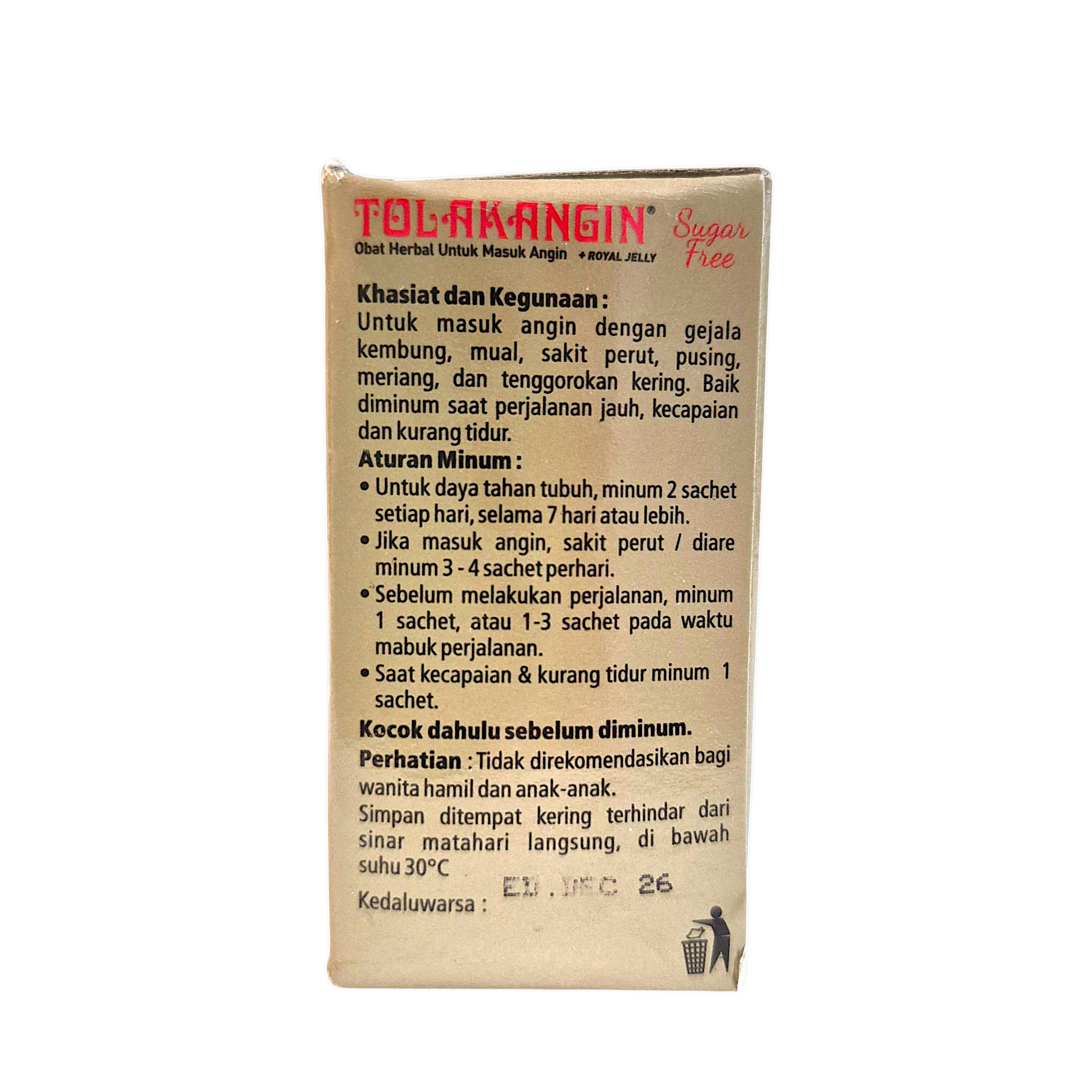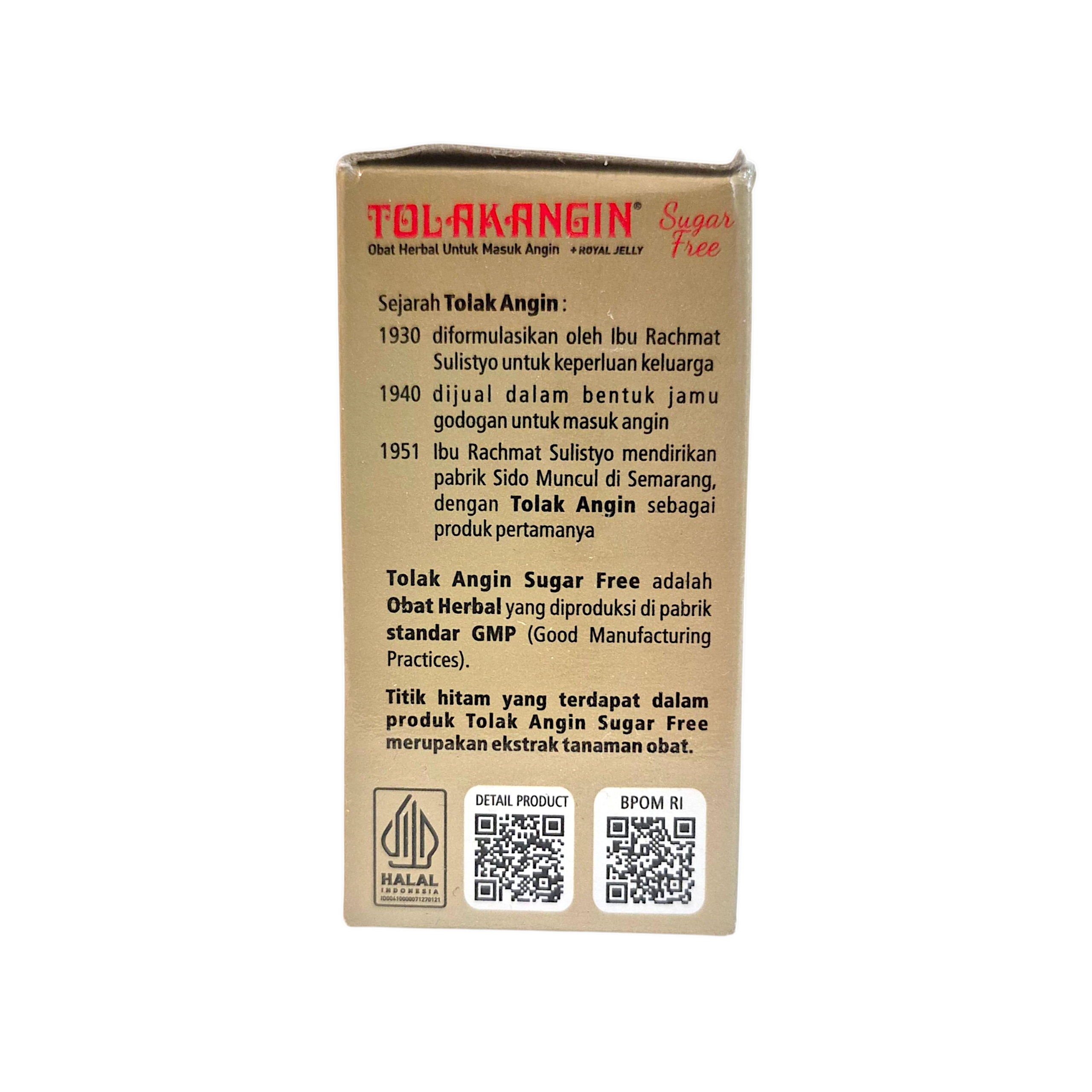Sidomuncul Tolak Angin is Indonesia’s trusted herbal remedy for relieving symptoms of masuk angin (wind-related discomfort), such as bloating, nausea, headaches, chills, and sore throat. This sugar-free version is enhanced with Royal Jelly and is perfect for adults seeking natural relief without added sugar.
